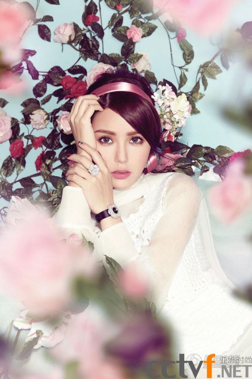 她迷人的眼神,深邃而不失妩媚,置身于一片花海中浪漫唯美,带着粉色发带的她更像公主般温婉柔媚。一袭白色的纱质及膝裙飘逸动人,蓝色的碎花抹胸裙同样如此轻而易举的撩动人心,难怪连“天王”周杰伦都拜倒在她的石榴裙下了。
