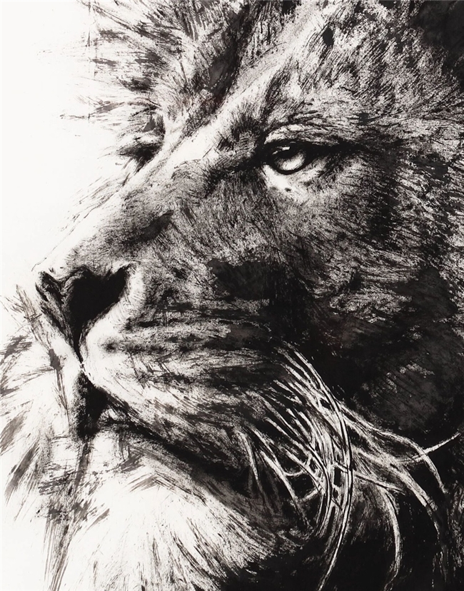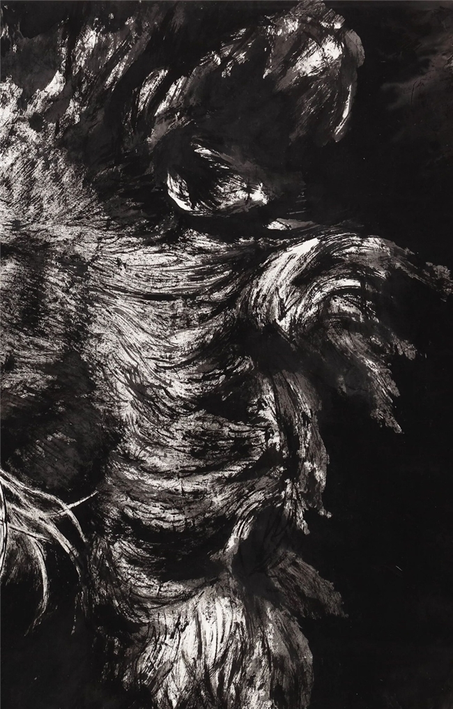 《醒狮》以“醒”为魂,以“狮”为象,捕捉雄狮由静入动的瞬间神态。画中狮首侧立,目光锐利而凝聚,既有久经沉潜后的冷静,又隐含即将爆发的力量。画面以浓淡相生的墨色塑造狮首轮廓,鬃毛如狂风翻涌,笔触苍劲而富有节奏,展现出生命的力量与张力。留白的背景与厚重的墨势形成鲜明对比,深化“醒”的主题,仿佛从虚无中苏醒。